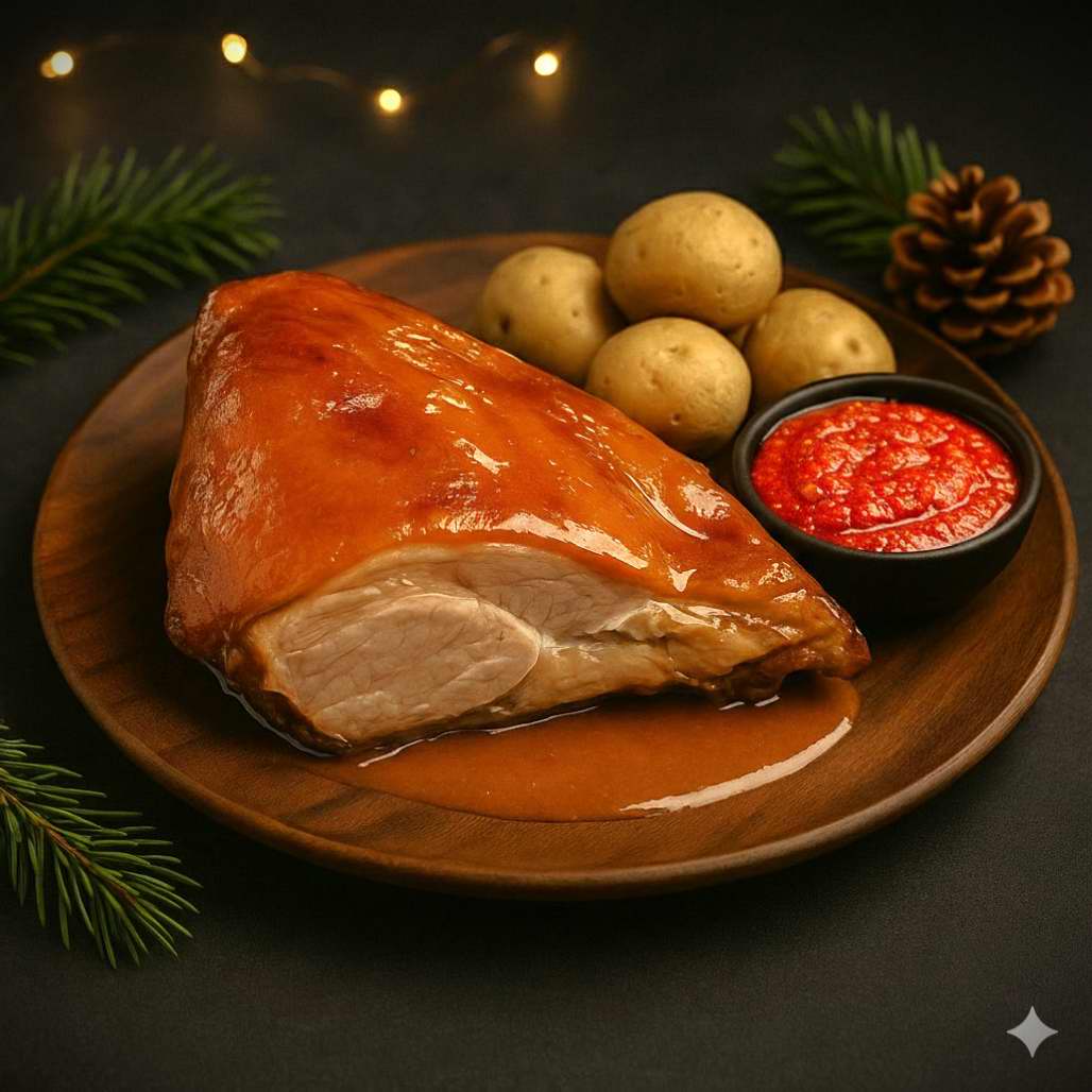 El cuarto de cochinillo lechal se hornea lentamente para conseguir una piel dorada y crujiente, con una carne tierna y llena de matices.