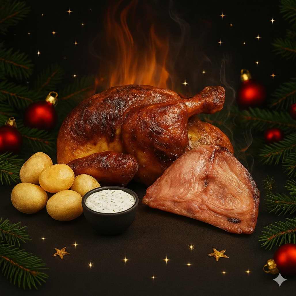 El sabor más emblemático de nuestra cocina. Este pollo marinado combina especias de inspiración peruana y española con el toque ahumado del asado al carbón, logrando una carne jugosa y llena de matices.