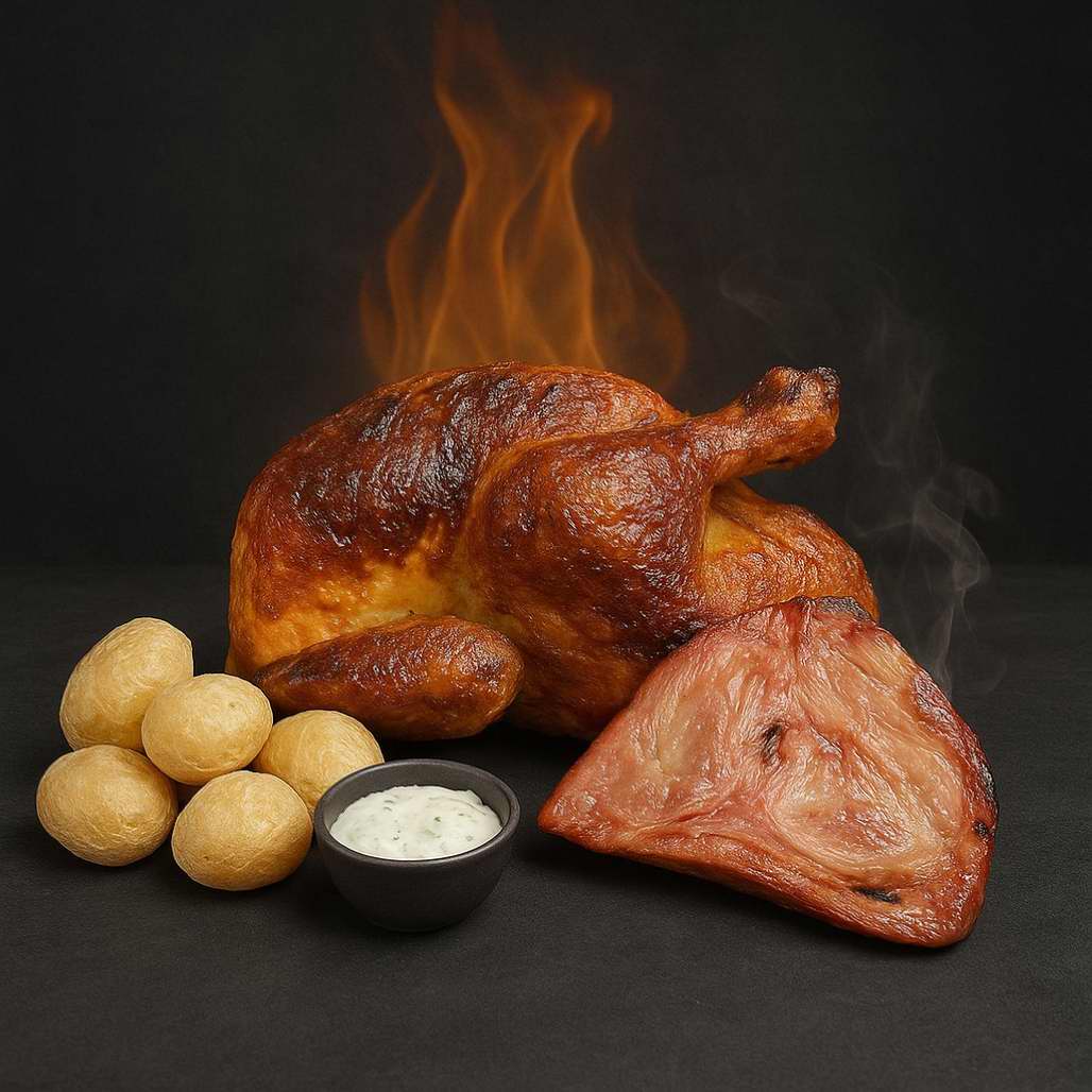 Una fusión perfecta entre la tradición española y la intensidad de la cocina peruana. Nuestro pollo al carbón se marina en la exclusiva salsa peruañola, una receta casera secreta que realza su sabor con notas especiadas y ahumadas.